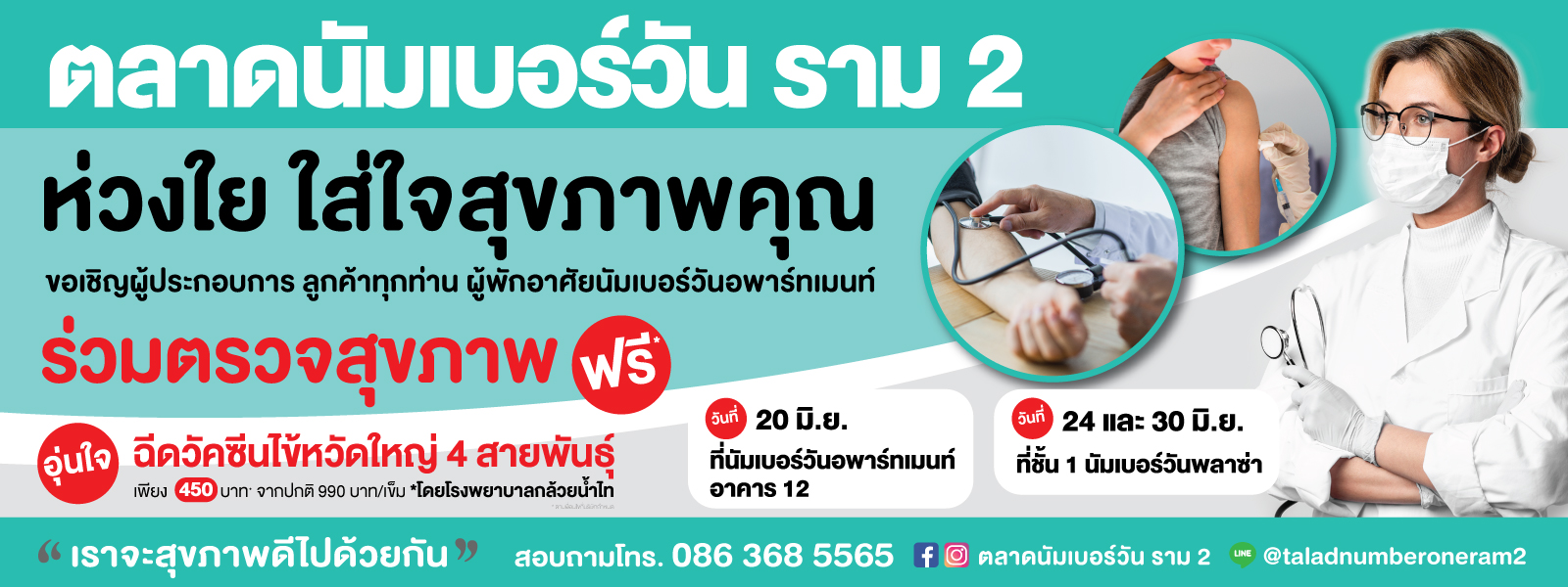 สำหรับการจัดกิจกรรมครั้งนี้ เกิดขึ้นจากแนวคิดที่ต้องการให้ลูกค้า ผู้ประกอบการมั่นใจว่าตลาดนัมเบอร์วัน ราม 2 ปลอดภัยในทุกพื้นที่ และห่วงใย ใส่ใจเรื่องสุขภาพ ต้องการให้ทุกคนแข็งแรงห่างไกลจากโรคภัยไข้เจ็บ โดยเฉพาะการเจ็บป่วยตามฤดูกาลอย่างไข้หวัดใหญ่สายพันธุ์ใหม่ ที่อาจส่งผลให้ผู้ป่วยเกิดอันตรายร้ายแรงถึงชีวิต ตลาดนัมเบอร์วันราม 2 จึงร่วมกับทีมแพทย์และพยาบาลจากโรงพยาบาลกล้วยน้ำไท ให้บริการตรวจสุขภาพฟรี พร้อมตรวจน้ำตาลและไขมัน สำหรับกลุ่มเสี่ยง และบริการฉีดไข้หวัดใหญ่ 4 สายพันธุ์ ประกอบด้วย สายพันธุ์ A/H1N1, A/H3N2, B VICTORIA, B YAMAGATA ซึ่งจะช่วยป้องกันและลดความรุนแรงของโรค โดยให้บริการในราคาพิเศษเพียง 450 บาท จากราคาปกติ 990 บาท